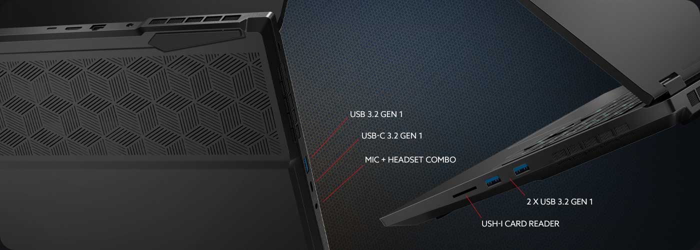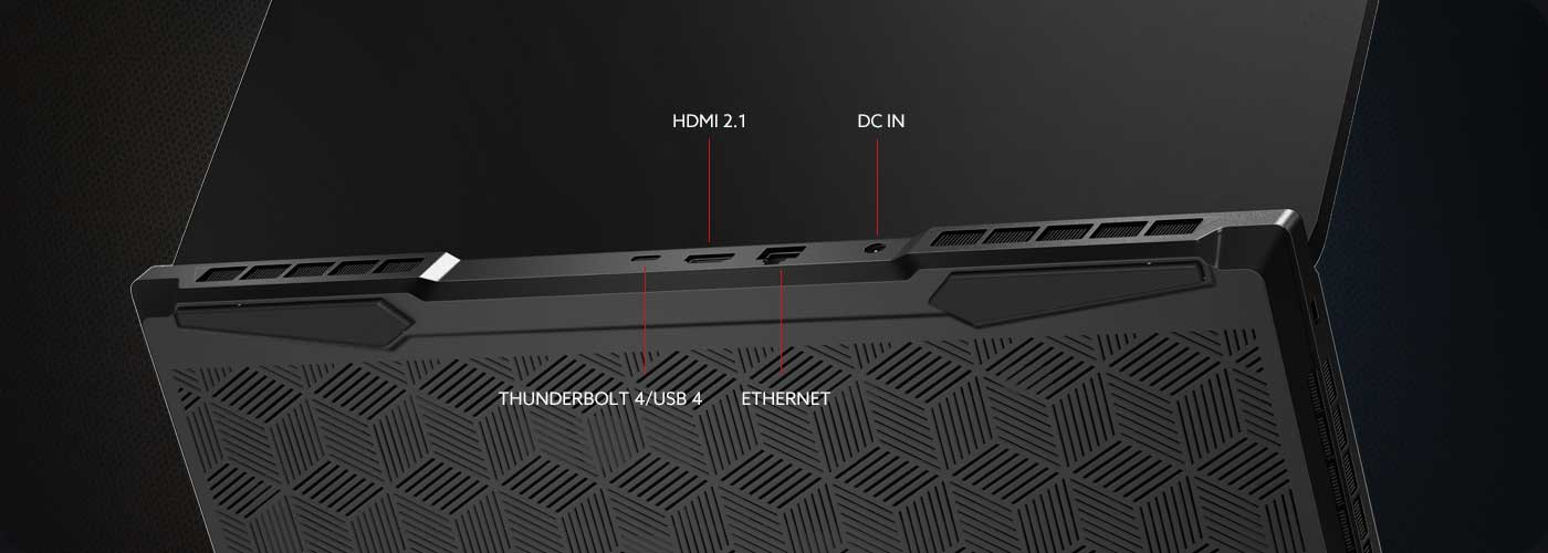 Prepared to meet any and all needs today, EON16-X is designed with three USB ports (Type A), one USB Type-C port with Thunderbolt 4 and power delivery support, an additional USB Type-C 3.2 Gen 2 Port, a Mic and headset combo port, one HDMI, Full Size SD Card Reader, and a Kensington® Lock Port. Using the Thunderbolt 4 ports, add on up to two 4K displays or a single 8K display. In addition, access the fastest connections for your games with built-in Wifi-6E.